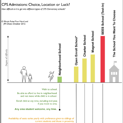 I’ve been trying to come up with a decent illustration of the barriers to “Choice” that are integral to the current CPS Elementary enrollment system, but I am not really a graphic designer and, wow, it is so complicated.
