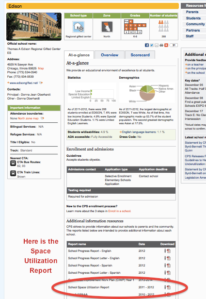 Each elementary school page on the CPS website has that school’s Space Utilization Report for 2011-2012 listed as a downloadable PDF.