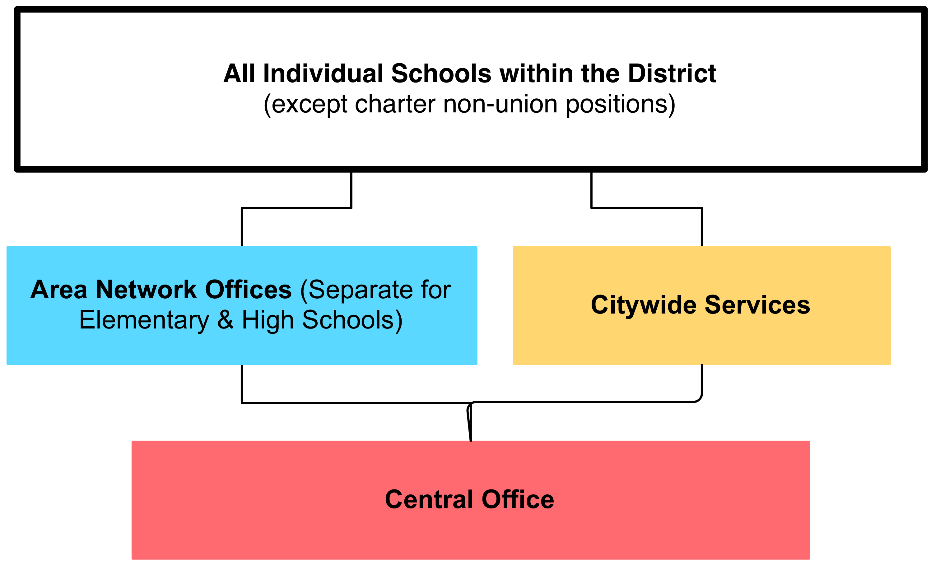 Network Offices include those positions that support the schools within a specific geographic area, with separate offices for groups of elementary schools vs. groups of high schools.