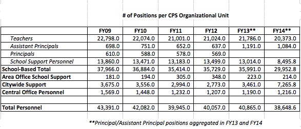 Citywide Services positions reside in different departments, such as City Wide Education General, City Wide New & Charter Schools, City Wide Special Education Resources, City Wide Specialized Service, CPS Warehouse (again), City WIde K-12 Advising, and–as of FY14–lunch staff and bus aides, etc.