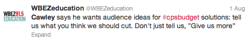 I’ve been following the CPS Budget Hearings on Twitter. I’ll focus on the one that would have been my budget hearing…the northside hearing with Tim Cawley. At that hearing, he asked the audience (parents and teachers) to suggest their own budget plan if they were unhappy with the one being presented.