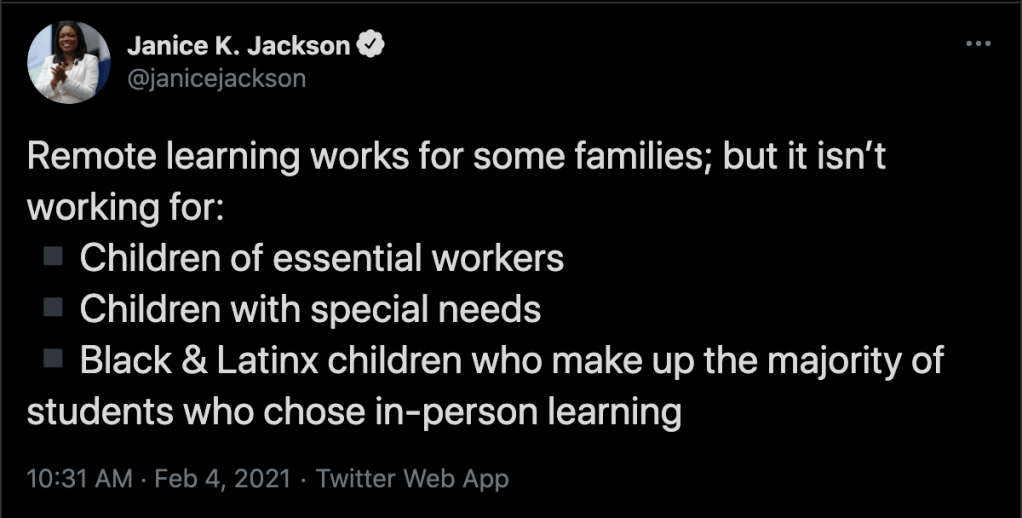 “Remote learning does not work for Black & Latinx children who make up the majority of children who chose in person learning.”