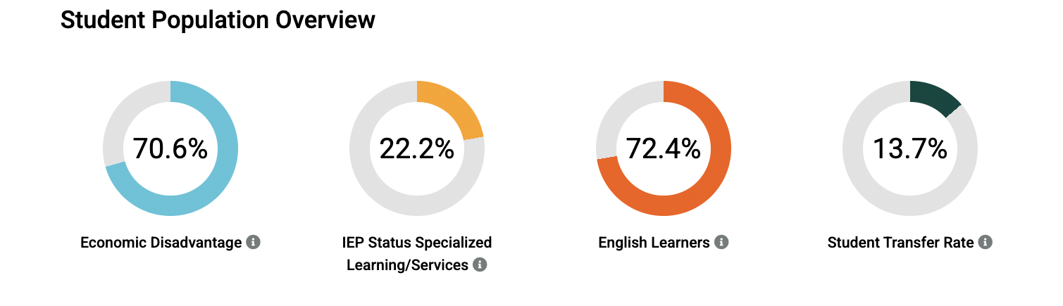 You’ll notice that the percentage of IEP students receiving specialized learning and services is 22.2% of all school students. And that 72.4% of the students in the school are classified as “English Language Learners”. This statistic, along with the Student Transfer (previously known as “Student Mobility”) rate of 13.7% leads me to wonder if this school is serving a population that enjoys less stability and predictability than students who are not low-income or recent arrivals to the community because of issues with housing, location of employment and support.