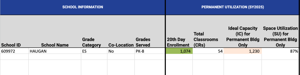First, CPS will deduct any modular or leased classrooms from the Total Classrooms listed for Haugan. But there aren’t any. So the Total Classrooms (54) remains the same.