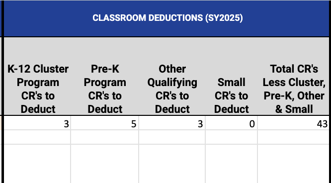 CPS uses the “Total CR’s Less Cluster, Pre-K, Other & Small” to calculate K-8 classrooms vs. Ancillary classrooms.