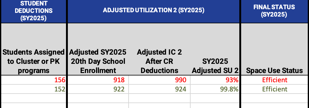 - Explained why the average classroom limit in the Space Utilization formula should be lowered from 30 to 28;